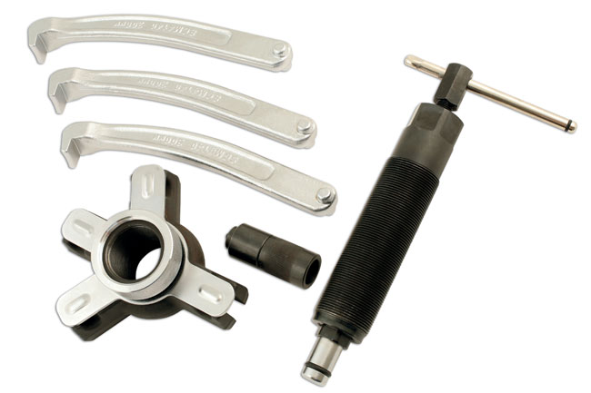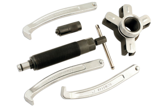 Heavy duty complete hydraulische trekker set van gesmeed en gehard staal. In kunststof opbergcassette. Voor lostrekken van lagers, poelies en tandwielen. Met verlengstukken en carbon stalen verbindingen. Vet de draadspindel altijd goed in.